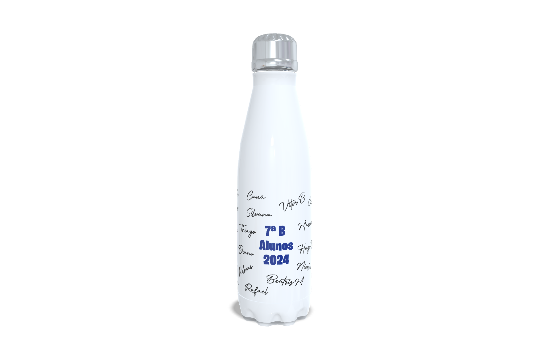 Garrafa térmica em inox dupla camada 500ml nas cores branca ou prata, mantém a água gelada por mais de 8 horas (sem caricatura).